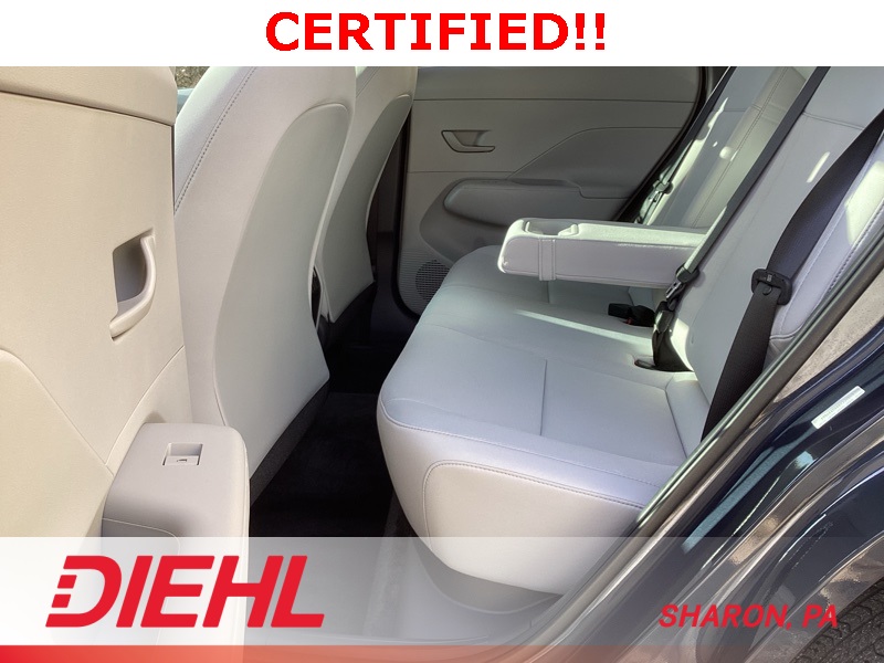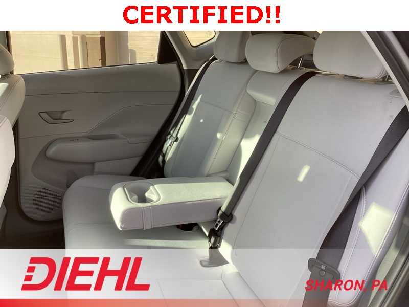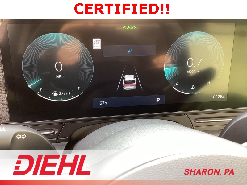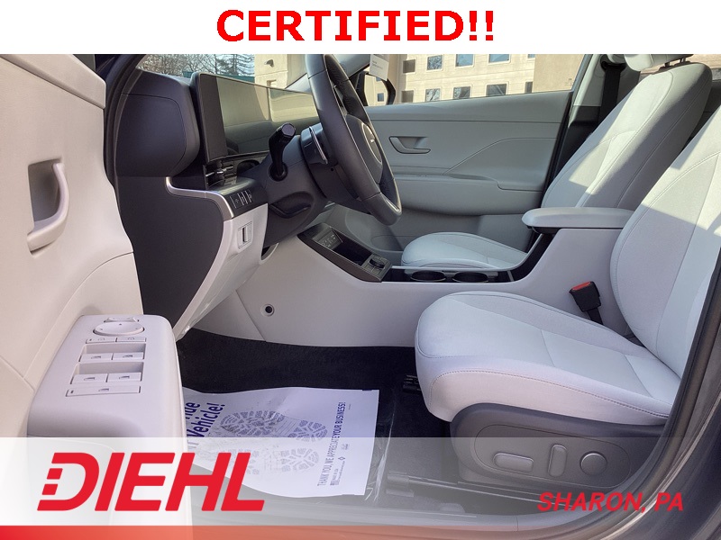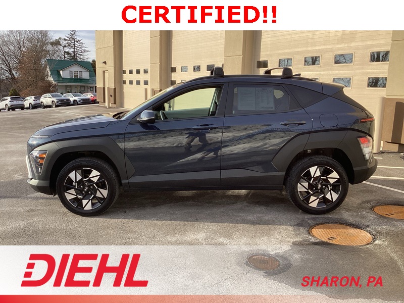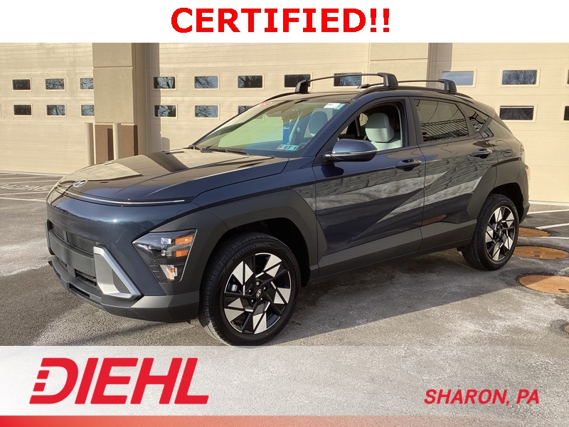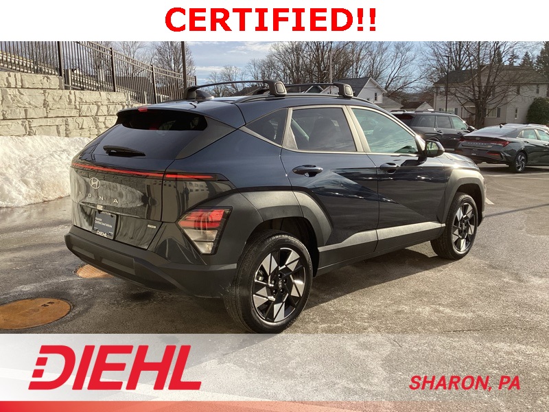 **CERTIFIED PRE OWNED**, 4-Wheel Disc Brakes, 6 Speakers, ABS brakes, Air Conditioning, Alloy wheels, AM/FM radio: SiriusXM, Apple CarPlay & Android Auto, Auto-dimming Rear-View mirror, Automatic temperature control, Bumpers: body-color, Cargo Blocks, Cargo Net, Cargo Tray, Carpeted Floor Mats, Cloth Seat Trim, Column-Mounted Shift-By-Wire, Cross Rails, Delay-off headlights, Driver door bin, Driver vanity mirror, Dual front impact airbags, Dual front side impact airbags, Emergency communication system: Bluelink+, First Aid Kit, Four wheel independent suspension, Front anti-roll bar, Front Bucket Seats, Front Center Armrest, Front dual zone A/C, Front reading lights, Fully automatic headlights, Heated door mirrors, Heated Front Bucket Seats, Heated front seats, Illuminated entry, Leather steering wheel, Low tire pressure warning, Navigation System, Occupant sensing airbag, Option Group 01, Outside temperature display, Overhead airbag, Panic alarm, Passenger door bin, Passenger vanity mirror, Power door mirrors, Power driver seat, Power steering, Power windows, Radio: AM/FM/HD Radio/SiriusXM w/Navigation, Rear anti-roll bar, Rear seat center armrest, Rear window defroster, Rear window wiper, Remote keyless entry, Security system, Speed control, Speed-sensing steering, Split folding rear seat, Spoiler, Steering wheel mounted audio controls, Tachometer, Telescoping steering wheel, Tilt steering wheel, Traction control, Trip computer, Turn signal indicator mirrors, Variably intermittent wipers, Wheel Locks, Wheels: 18" x 7.0J Glossy Black Alloy. Certified. Denim Blue Pearl 2025 Hyundai Kona SEL Convenience AWD CVT 2.0L I4 DOHC 16V