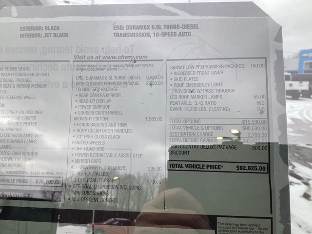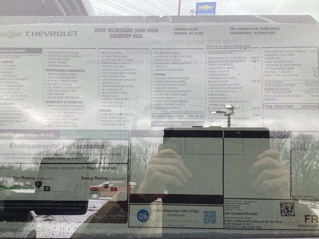 Black 2026 Silverado 3500HD Chevrolet High Country 4D Crew Cab 4WD 10-Speed Automatic Duramax 6.6L V8 Turbodiesel Price includes: $1000 - Chevrolet Consumer Cash Program. Exp. 03/31/2026