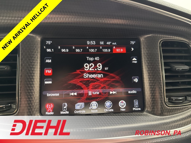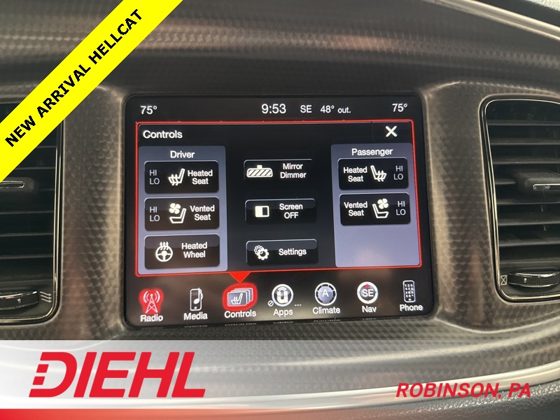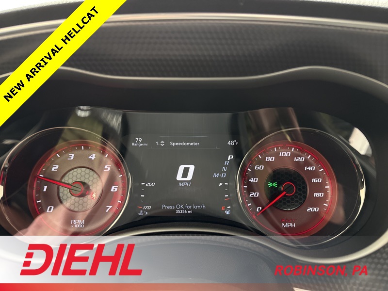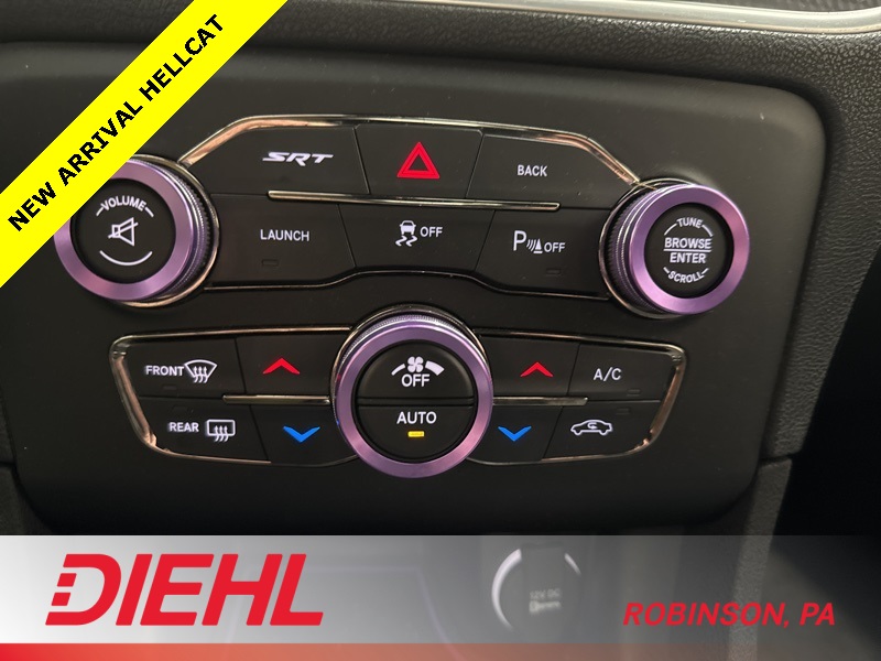 Inside, the cabin balances raw performance with premium comfort. You’ll find heated and ventilated performance seats, heated rear seats, heated steering wheel, and a driver-focused cockpit with SRT performance displays and a configurable digital instrument cluster. The infotainment system includes Uconnect with navigation, premium audio, Bluetooth connectivity, and steering-wheel-mounted controls, making this just as enjoyable on long drives as it is thrilling on short ones.