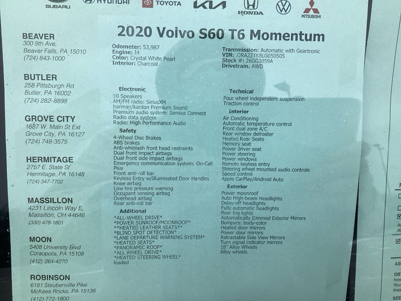 Crystal White Pearl 2020 Volvo S60 T6 Momentum 4D Sedan AWD I4 Automatic with Geartronic