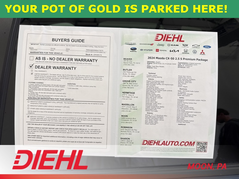 With just over 20,000 miles, this 2024 Mazda CX 50 2.5 S Premium SUV delivers style, capability, and smart technology in one beautifully balanced package. If you are ready for an SUV that looks sharp, drives confidently, and makes every trip feel a little more rewarding, come see it today at Diehl of Moon. Vehicles this well equipped and this good looking do not hang around for long.
